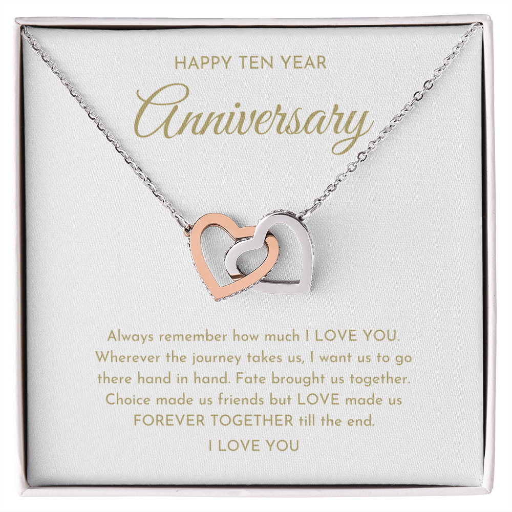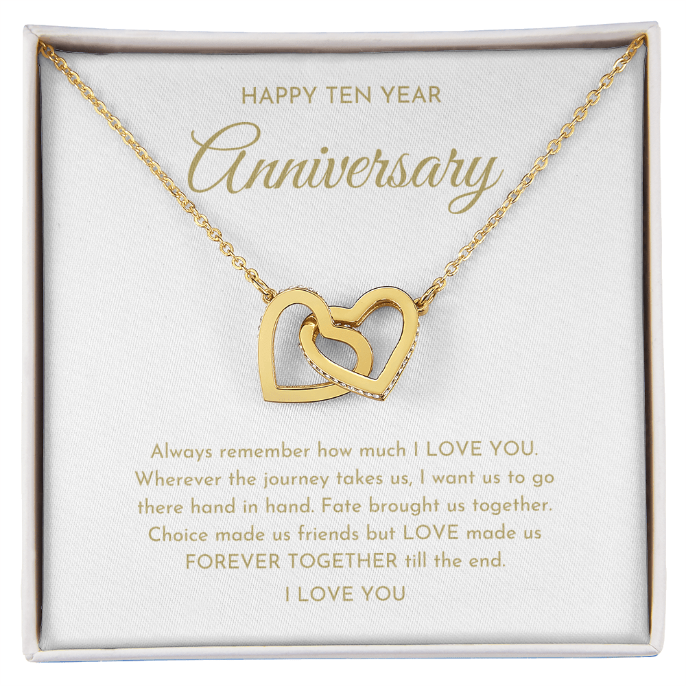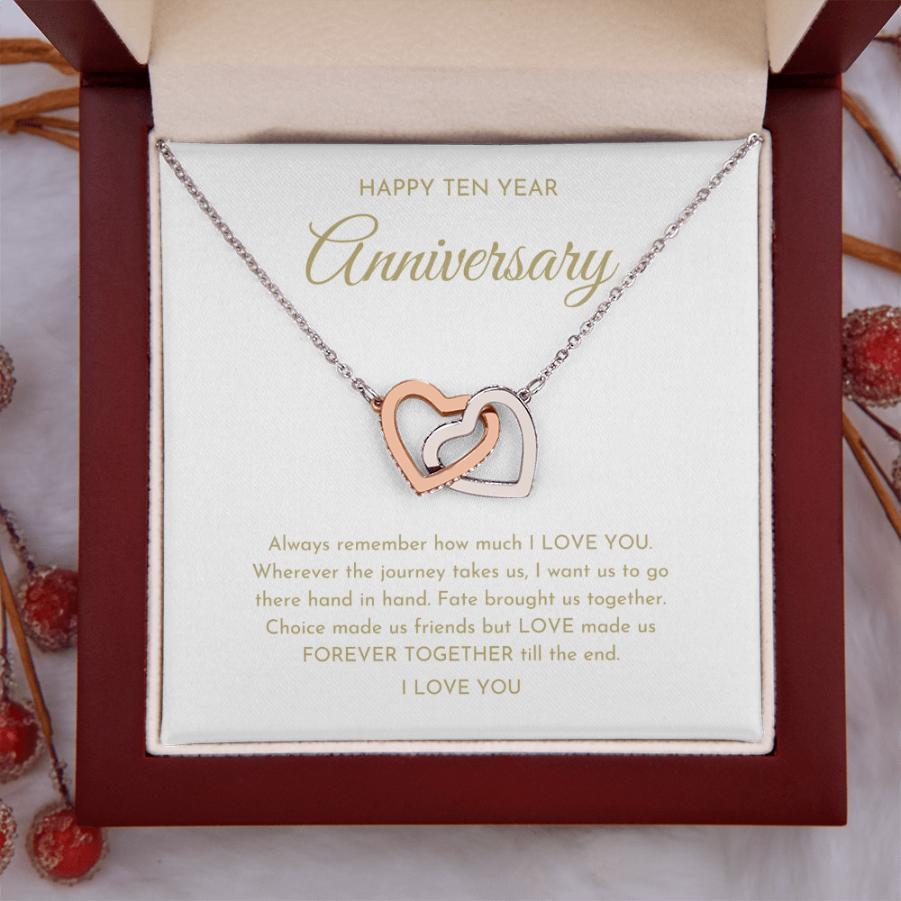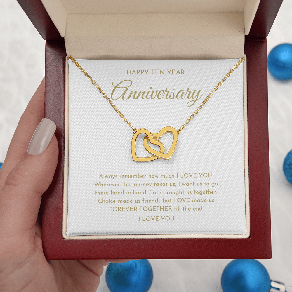 Your happy ten year anniversary interlocking hearts necklace is lovingly packaged in a complimentary soft touch box for easy gifting. Elevate your presentation by upgrading to the mahogany style luxury box, which features a brilliant LED spotlight.
