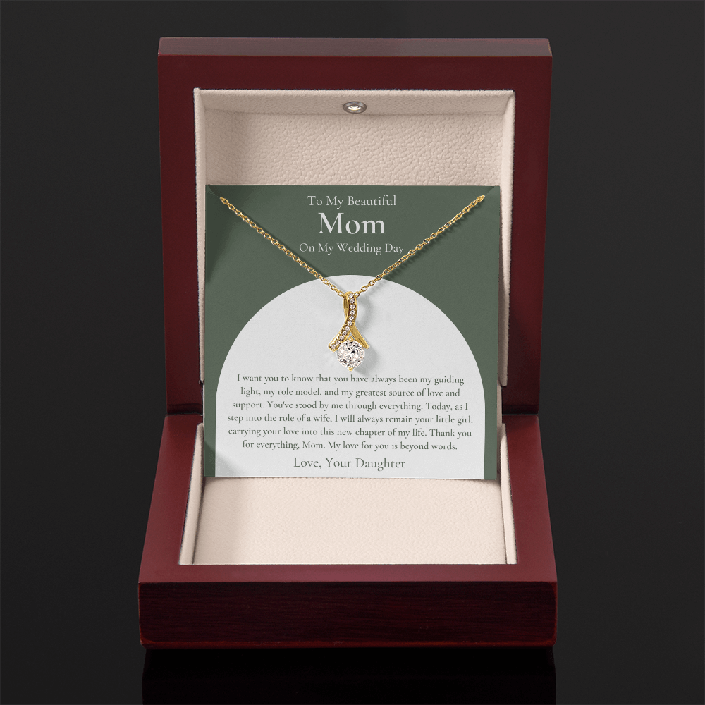 Your To My Mom On My Wedding Day necklace is lovingly packaged in a complimentary soft touch box for easy gifting. Elevate your presentation by upgrading to the mahogany style luxury box, which features a brilliant LED spotlight.