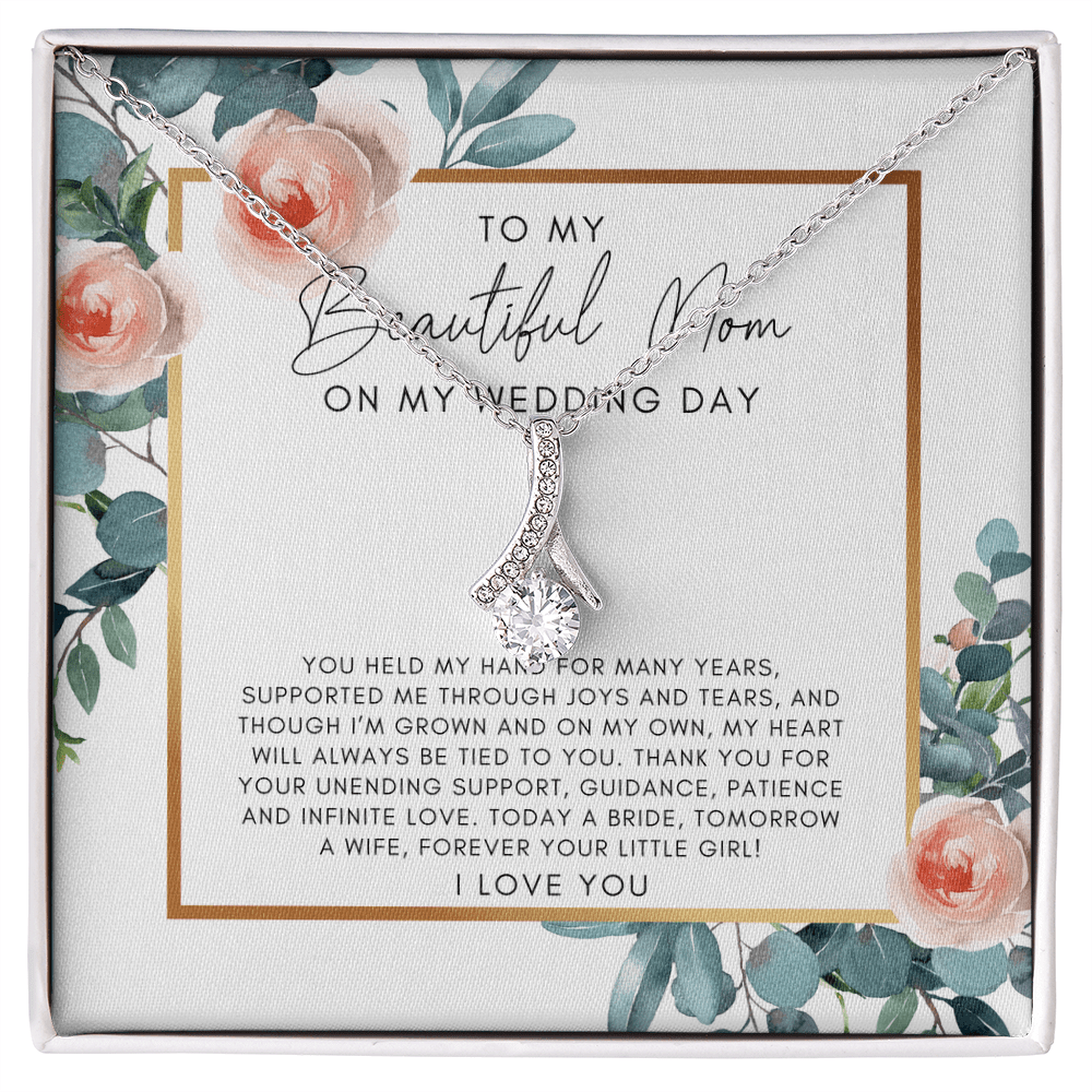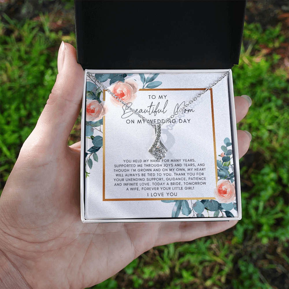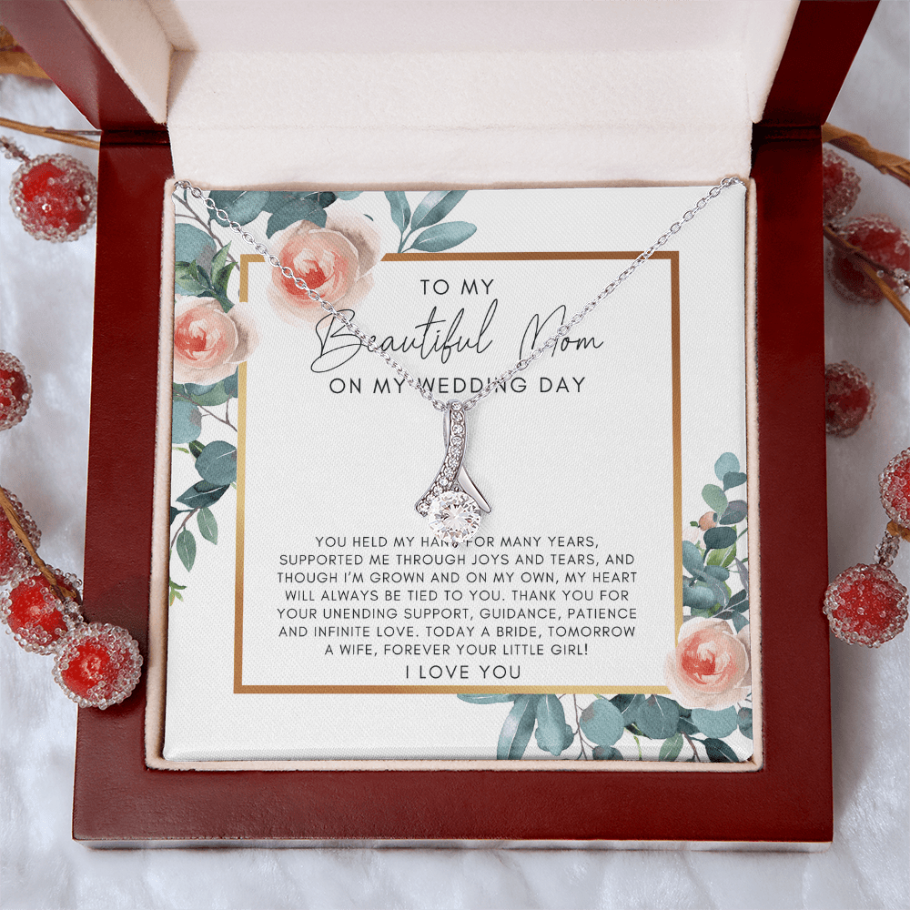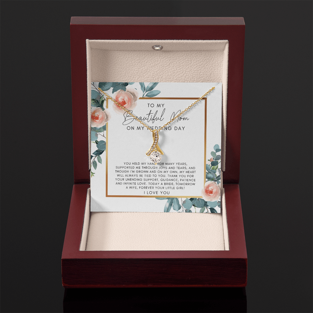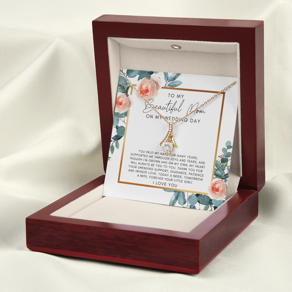 Your To My Mom On My Wedding Day necklace is lovingly packaged in a complimentary soft touch box for easy gifting. Elevate your presentation by upgrading to the mahogany style luxury box, which features a brilliant LED spotlight.